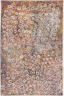 The design in three colours of white, yellow and red consists of white circles and lines over yellow and red ochre dots on a brown ground.