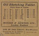 Oil Sketching Tablet./Stock Sizes in Inches./...[various sizes listed].../WINSOR & NEWTON, LTD.,/LONDON, ENGLAND./SIZE OF THIS TABLET; 14 x 10 inches...