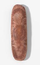 This shield is painted with designs associated with the possum dreaming. The central roundel indicates an important possum dreaming place and the arc shapes indicate Tjakamarra and Tjupurrula custodians of this Dreaming. The tracks of the possum ancestor are also represented. The configuration of white dots in the ground with red ochre symbols is characteristic of men's ritual shields.