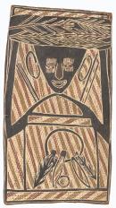 The artist depicts an ancestral being with spears, stone knives silhouetted over 'rarrk' (cross-hatched body designs)