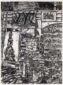 Studio interior is a four panel drawing that combines Senbergs's direct, authoritative graphic mark and his acute powers of observation. He has depicted the interior of his studio in North Melbourne and has often used his working environment as subject matter for drawings. The ordered clutter of Senbergs's studio contains the materials of his profession, other works in various states of completion scattered about the space, favourite objects, furniture, the kitchen and bar areas. Senbergs has used dense black pastel to depict the interior in a bold, powerful line.