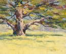 Depicts a large tree, whose branches spread across the composition and cast a slight shadow on the grassy field. The paint is app...oad, short strokes and the colour is of a particular high key.