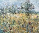 Shows a golden cornfield surrounded by flowers, the most prominent being white dahlias. Once again the paint is applied with great vigour and dribbled and scratched onto the surface. A toy mouse is afixed to the lower right hand corner of the composition.