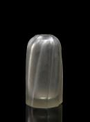 In clear glass with lustred surfaces, the cylindrical form is wheel-carved with longitudinal flutes which spiral slightly around the form; the vessel sits on a flat base and tapers to a domed top with a small circular aperture.
