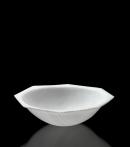 In opaque white glass, the octagonal form with a broad circular concavity; composed of a series of 'ribbons' of white and cloudy glass fused into a whole. The bowk sits on a rounded base.