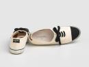 White canvas deck shoes, with contrasting black toe sections and black shoe laces. The rim around the edge of the white rubber sole is also black. There are four pairs of metal eyelets at the centre opening. The opening is finished with white cotton tape.