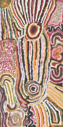 This painting shows a woman with digging sticks and coolamon out collecting food in the desert in her country where she was born. A non poisonous snake ancestor called Tjartjal is shown looking for a new home in a rockhole. Bush tucker, including mundarloo and bush carrot are also represented.