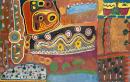 The painting contains eight vibrant sections which flow into each other to form a kaleidoscopic vision of the artists' shared affinity with differnt tracts of land. Most of these artists view the land in lateral perspective and paint in flat blocks of colour, using little dotting, with the exception of Nipper Rogers whose central image contains concentric circles, dots turtles and a dramatic serpent but no figurative topographical elements.