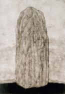 inscribed in black fibre-tipped pen on reverse u.r.: (upward arrow) / HAUT / 195 X 135_ / Mai 1988_ / Laque Ripolin- / "Mégalithe" / le groumellec / BAS / (downward arrow)