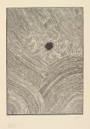 The artist depicts a willy willy or swirling dust storm. The monochrome design has a strong linear rhythm.
