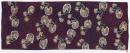 The object is a rectangular length of silk fabric. Design consists of two yellow and white flowered waterlillies repeatedly, consecutively. These motifs are surrounded by red dots. The background is black. Attached to one edge of fabric is a small, cream, rectangular label. The inscriptions is in gold and it reads: Merepen Arts, Naulya, Daly River NT, Australia.