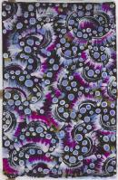 Object is a rectangular length of fabric. Design consists of purple, blue, white, grey and red circular arcs surrounded by sun ray images on black black Attached to one edge of fabric is a small, cream, rectangular label. The inscription is in gold and it reads: Merepen Arts, Nauiyu, Daly River, NT, Australia