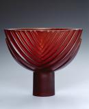 In cast, translucent red glass, the vessel form is in the shape of a plant (flax) pod with its 'stem' consisting of a short cylindrical column. The external surface with moulded 'ribs'.