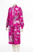 (a) label, centre back neckline, woven in green on white synthetic fabric: Emilio Pucci s.r.l. / FLORENCE - ITALY / 100% PURE SILK / MADE IN ITALY