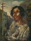 inscribed in pen and ink on paper label on reverse u.l.: THE DISINHERITED / 20 GNS. / MARGO MAHOOD / 22 STAWELL ST / KEW / ---- / "Lost in a world they do not understand / Robbed of their dream, their freedom and / their land, / Gone is their heritage - and all their share / The tawdry trifles that the white can spare" / (McCullagh)