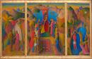 Justin O’Brien commenced art studies at the age of thirteen, and left school the following year to become a full-time apprentice with a local Sydney painter,Edward M. Smith. O’Brien subsequently taught art in Catholic schools. Immensely talented, in his early twenties he was a finalist in the Archibald Prize for portraiture in 1937, 1938 and 1939. Enlisted into the army during the Second World War, O’Brien was posted as a medical orderly to Ekali, Greece, where he discovered the traditions of Byzantine icon painting. This aesthetic was to inform his art practice from this point onwards. The elongated figures, mountainous landscape and hot colours in this triptych are all derived from this Byzantine style.