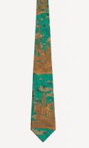 Woven silk brocade tie, with repeat pattern depicting a collage of key buildings from major European cities in pale orange. The buildings are on a background of emerald green sky with yellow clouds and random arcs of black stars. Lined in grey silk fabric with repeat self-pattern of designer's initials.