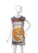 The A-line minishift is made from two tea towels printed with an image of a plate of Fish and chips, and the slogan 'The Great British Take-away', surrounded by a border of Union Jacks. The dress has a black cotton mesh yoke, outlined with blue cotton piping and trimmed with bright orange plastic ribbon. Each side fastens with six pairs of gold metallic eyelets, threaded with black plastic cord.