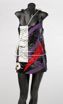 The A-line shift of black vinyl is painted on the front with circles and wavy lines in purple, white, red and blue, appliqued with a white slashed plastic rectangle and a red slashed plastic triangle covered in clear plastic. A zip fastener runs along the proper left side. A white plastic tubing length wraps around the dress, threaded through two silver metallic rings attached at each side of the waist.