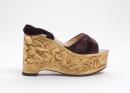 Sandals with high wooden platform, carved with a flower and leaf design, painted in metallic gold paint and clear lacquer. The base of the platform curves up at the toe and down at the rear of the of the sole, forming a flat heel base to balance the sandals. The uppers are of a wine coloured silk velvet, which is printed with an abstract design in black, and consist of an open toed leather lined panel across the front of the sandal and two long ties for fastening at the ankle. The insole and sole are leather and the top piece of the heel is black resin.