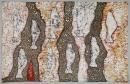 Object is a rectangle textile with finished edges. Design consists of one or two streaked grey and white dugongs in seven consecutive panels. The background of the panels consists of streaks of red, white, blue, yellow and brown on white background and red, white and yellow dots on black background.