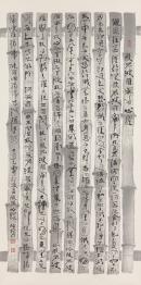 The Heart Sutra (Prajnaparamita Hrdaya Sutra), a Buddhist text, is written in the regular and semi-cursive script of Chinese calligraphy on a background of broad vertical and horizontal strokes of ink wash. It appears that the text is written or incised on a bamboo fence. It is also reminiscent of ancient texts written on bamboo strips that were tied together with thread or leather strings and then rolled into a handscroll. [Such bamboo strips with early writings have been found in burial tombs dated to the 5th-3rd century B.C. in China. This early book form must have influenced the way a Chinese text is read vertically from top to bottom and then from the right to the left column]. The style of the writing is inventive, lyrical and whimsical. It is also evocative of incised inscriptions on oracle bones (e.g. shoulder-blades of oxen or tortoise shells used for divination) of the early Shang dynasty, 12th century B.C.