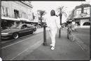 Aboriginal woman standing on the corner of Acland St dressed in white