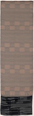 The textile hanging is made with a series of hand dyed and handprinted fabrics pieced together in a narrow length. Several metres of brown silk organza are printed overall with a black grid pattern. A wide border of black velvet is printed with the devoré method (a chemical discharge process, which dissolves the pile) leaving a sheer geometric impression. The top of the hanging has a narrow slipcase for a dowel to facilitate the hanging of the work.