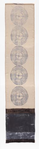 The textile hanging has several metres of beige silk satin printed with a series of black roundels in an intricated lace-like pattern. The satin merges into a band of dark brown velvet printed in beige with a geometric pattern , attached to a narrow border of pale grey velvet, printed with a darker grey diamond pattern. The hanging finishes with a band of dark brown velvet with a devoré geometric pattern; the section is also lined with beige silk satin, masking the sheer sections of the cloth. The top of the hanging has a narrow slipcase for a dowel to facilitate the hanging of the work.