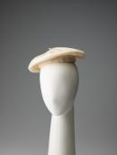 The beret is off-white cashmere knit, is formed by seven darts radiating from the centre crown and supported by a ribbed headband.