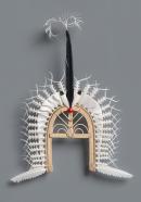 cane, feathers, cotton, shell, synthetic polymer paint