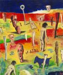 busts (sculpture) dog (species) figurative art imaginary views multi-coloured nudes (representations) poles (object genre) primary colours