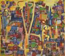 automobiles bird's-eye views buildings (structures) complexity (artistic concept) flat (form attributes) multi-coloured naive art outlines (linear form)