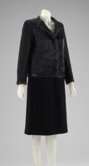 (a) The jacket is black velvet which is heavily embroidered with vertical rows of black glass bugle beads. The edges and pocket trims are decorated with black glass and jet beads and silk cord braid. The neckline is cut to sit open and form a single-pointed lapel and fastens at the centre front with four black plastic faceted buttons. The lining is cream silk and the inside hem is weighted with metallic gold chain.