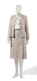 (a) Raw silk, wool blend fabric woven in a textured linear pattern in cream, grey and beige. Gold metallic braid trims the collar centre front edge, sleeve cuffs and pockets. The jacket fastens at the centre front with four gold metallic buttons, each embellished with interlocking 'C's. The cuffs are also trimmed with matching buttons. Lined in cream silk, the jacket hem is weighted inside with a metallic gold chain.