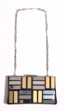 Rectangular shoulder bag in black vinyl supported by a silver metallic frame and fastening with a snap clasp at the centre top. The front is decorated with appliqué rectangular metal plates, eight with a matt gold metallic surface attached vertically and twelve with a shiny silver metallic surface placed horizontally. The back is unadorned and the shoulder strap is formed with twenty-four silver metallic links joined by small circlets. The inside of the bag is lined with black polyester satin and features a small patch pocket.