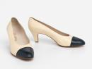 Cream coloured shoes with an almond shaped toe with a navy coloured toecap and a narrower heel. These shoes have leather uppers, insides and soles, with topstitching around the opening of the shoes.