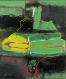aluminium (metal) brush strokes curves (geometric figures) green (colour) lines (artistic concept) painting techniques red (colour) scraping