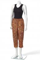 Pair of silk trousers with batik design in white, yellow, orange and brown hues. The waist is elasticised and gather tightly along the top edge. The hemlines and seams are single machine stitched rows.