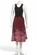 Wrap around skirt in batik on silk, dyed in burgundy and pink shades. Design along the centre and hemline features small animals and motifs. Skirt fastens with two ties at the waist.