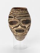 Teeki totemic. The design is incised in low relief, incised lines filled with white pigment. The ovoid forms depict bodii fruit, one of the artist's clan totem.