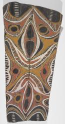 The painting depicts the insects by means of its wings (chepi) and a stylised anthropomorphic ‘face’ (misoma). The face shown twice - in the upper half of the design and reflected across a horizontal mirror line in the lower half, each face has a pair of large black eyes, nose (sumojii) in the form of a black pointed oval outlined in white and bisected by a yellow bar and a carved mouth (kuja).