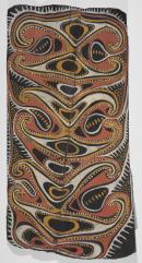 The green parrot subject in this painting is one of the many varieties of fruit-eating birds found in the hills of Washkuk. The bird is represented highly schematically with only its outstretched wings and torso depicted. The wings are represented by the three pairs of red heart-shaped forms outlined in white and arranged in a column: one at the top of the bark, one in the centre and one closer to the bottom. The bird’s body is represented by small roundels outlined in each yellow or white distributed along the design’s central long axis.
