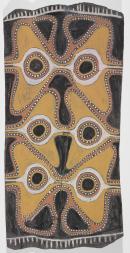 The painting represents a butterfly, one of the artist’s clan totems. The insect is depicted sitting on a leaf with its wings outstretched as shown at the top, centre and bottom of the design. Three pairs of yellow triangular forms represent the insect’s wings, three roundels outlined in red and white depicts its eyes, the red U-shaped forms at the top and bottom of the design are different representations of the insect’s nose or proboscis.