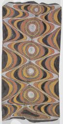 The painting depicts the metre-high chopping waves that can suddenly form on large lagoons and on the Sepik river when strong winds start blowing. The choppy waves are represented by the zigzag red, black and yellow lines. The white lines depict the long ribbons of yellow foam that are blown off the crest of breaking waves and scattered in ribbons across the surface of the water. The white roundels arranged in a column in the centre of the design represent the powerful forces that generate the waves.