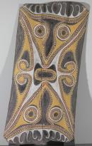 The painting depicts a type of large edible larva found in the thick woody stump of the me poko vine, hence its name: the ‘me poko (vine) larva’ (me, wood; poko, vine; ow, larva). The animal is shown, highly schematically, at two different stages in its life-cycle: as a larva and as a mature insect of imago. The grub is represented by means of a large triangular ‘face’ (misoma), shown in the upper and in a mirror reflection in the lower half of the painting. Each face possesses a pair of large black ‘eyes’, a black bulbous ‘nose’, and a black ‘mouth’. The ‘mouth’ represented by the black ovoid form in the centre of the design, is shared by both faces; these two images, therefore, are partially merged. The mature insect is represented by its antennae (boriina boriina); these are two pairs of white hooks formed in the centre of each side of the design.