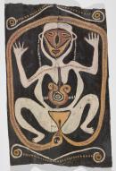 The painting depicts a mythical woman named Tubishikay, an unmarried woman who found the penis-sheath left by a python when it left its lair to go hunting floating in the pool whilst foraging in the forest. Thinking it to be a fish, she took it home to eat but when she tried to cook it, the ‘fish’ refused to cook and several times, the ‘fish’ leapt off the flame and on to the ground. The woman became impatient and ate the ‘fish’ raw and when the python returned to his lair and discovered his penis-sheath missing, he was informed by other spirits that it was taken by the young woman. The python tracked to her house and told her parents that because she had eaten his penis-sheath, she had to marry him.