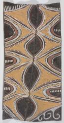 The brightly coloured caterpillar (hoposhopo) named yopomeshe depicted in this painting is one of the largest found in the Washkuk Hills. The yopomeshe caterpillar is possibly the larval form of one of the giant Birdwing butterflies that abound in this region. In this painting, the four black pointed ovals represent different segments of the caterpillar’s body. The yellow triangles outlined in white and red on the two sides depict its many short legs (yatii).