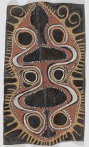 The painting depicts the bright red mature fruit of the ‘female’ (mima) variety of bodii tree, one of the artist’s totems. The bright red fruits are represented by the three pairs of black roundels positioned at the top, centre and bottom of the design respectively. Two large black ovoid forms in the centre of the bark represent the tree’s trunk, and two serpentine white lines that wind around the fruit and trunk are the branches from which the fruit hang.