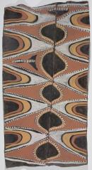 The geometric design is a representation of the metre-high choppy waves that can suddenly form on the Sepik River. The white V-shaped forms arranged in two columns on either side of the bark as the waves with their foamy crests. The column of black ovoid forms positioned on the design’s central axis depicts ‘the underwater forces’ that generate the waves. The dotted white lines outlining the black lozenges represent the long ribbons of yellowy foam that blow off the tops of the breaking waves and spread across the surface of the water.